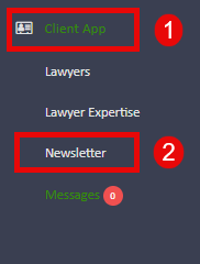The Client App module consists of four main management pages that control different aspects of the client portal experience: Lawyer Expertise, External Lawyers, Newsletter, and Messages.