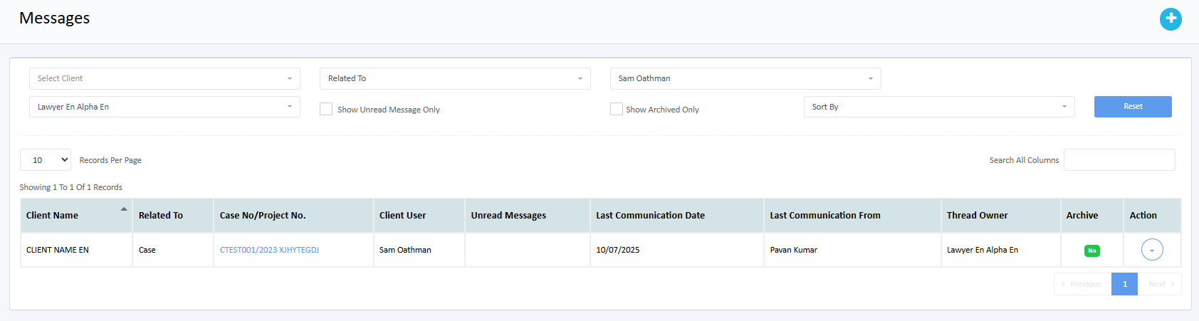 Messages is used to manage communication threads between law firm lawyers and their clients. This module enables secure messaging through the client portal, allowing lawyers to maintain professional communication with clients regarding their cases, projects, and general inquiries.