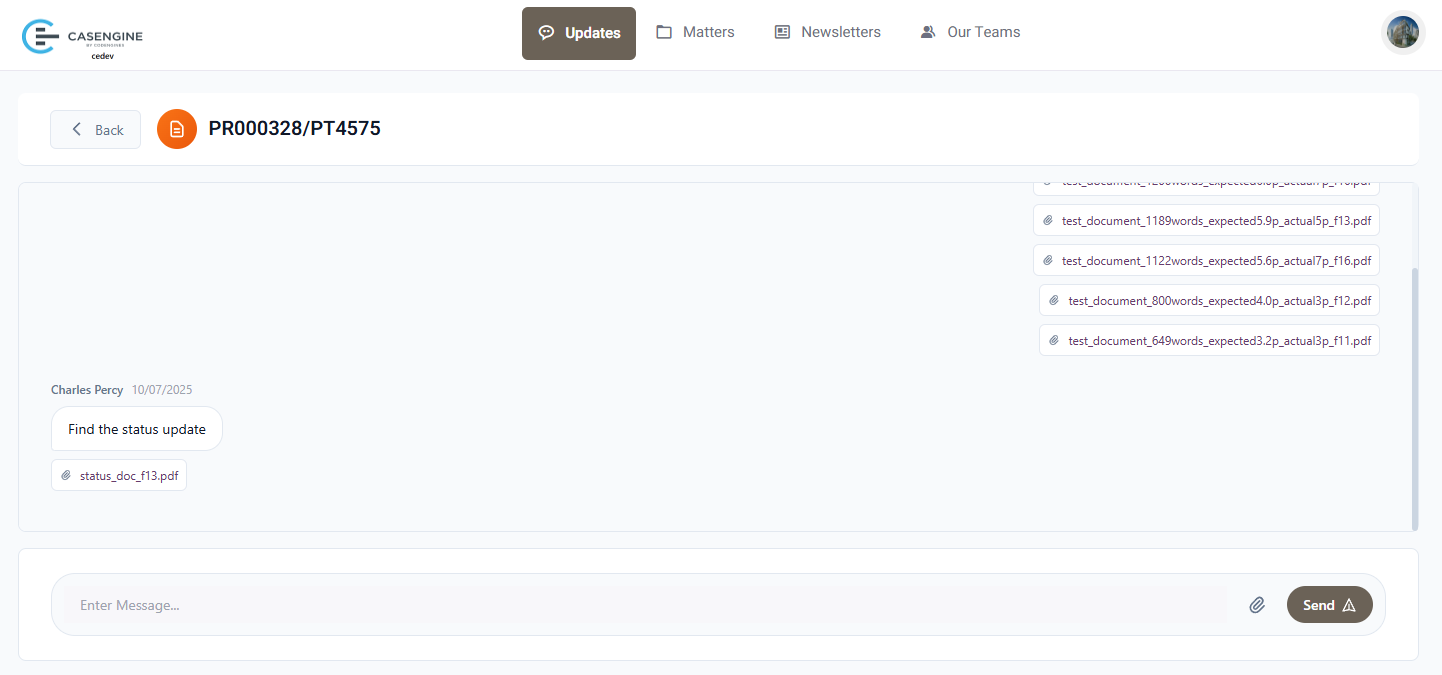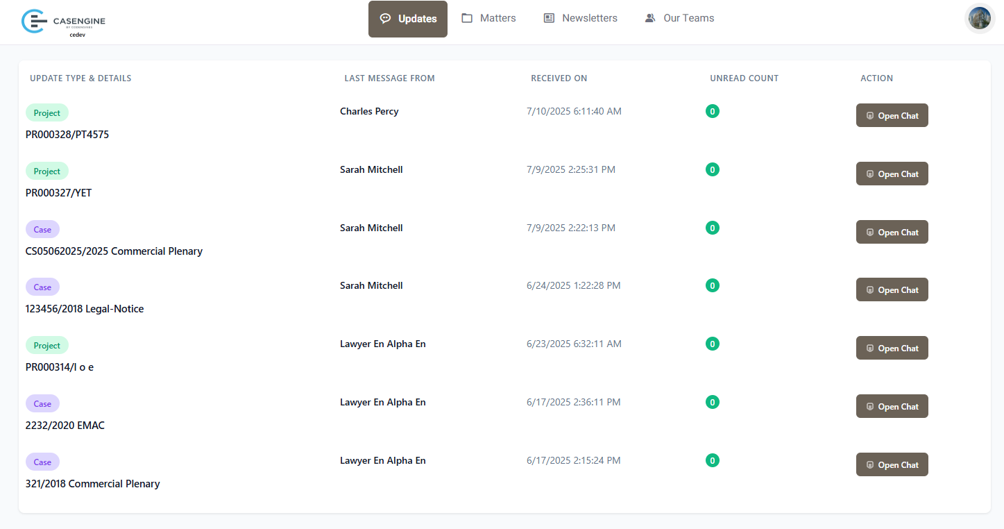 The updates page shows all communications specific to selected cases or projects.
