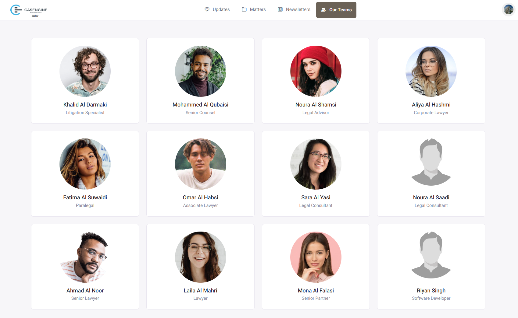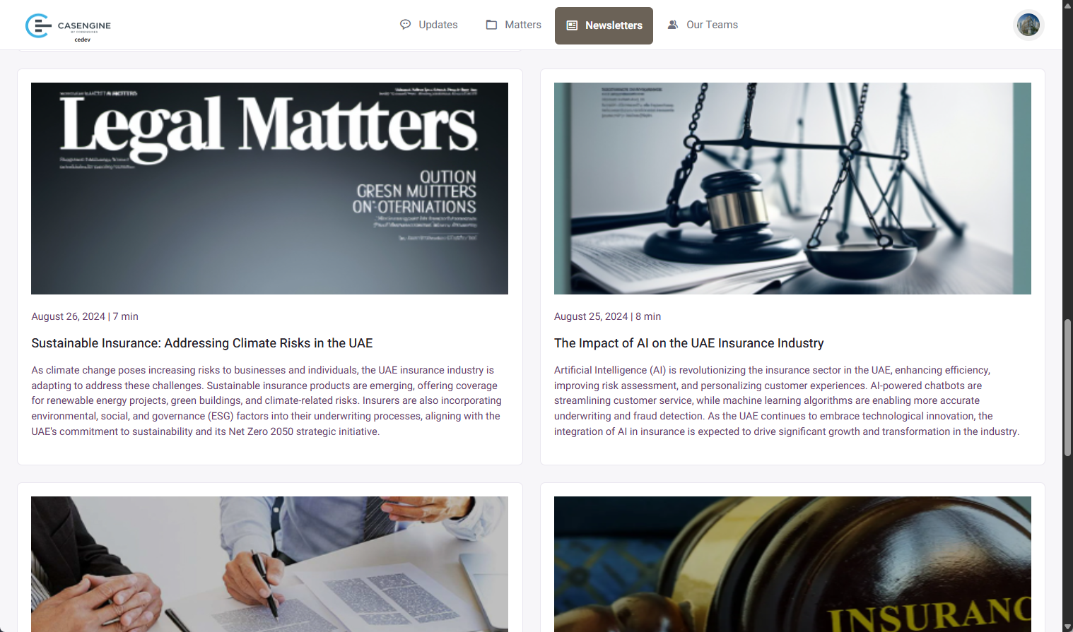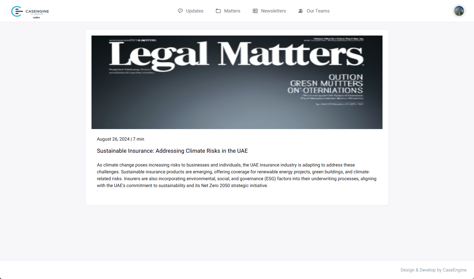 - Navigate between Updates, Matters, Newsletters, and Our Teams sections using top navigation tabs