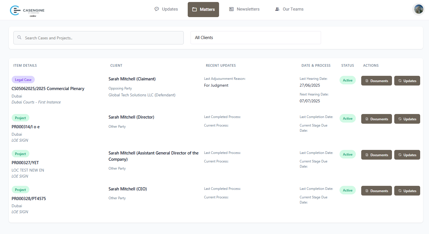 - Recent Updates: Last adjournment reason for cases, process status for projects