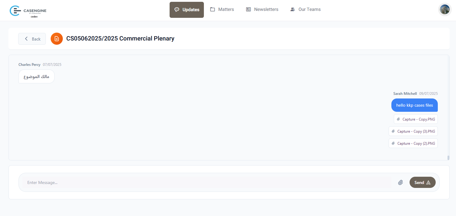 Case-specific updates screen with communication history, message composition area, and file attachment functionality