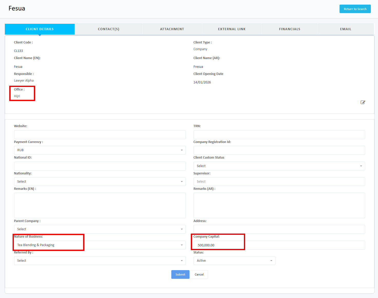 | Client Module Enhancements | New fields added: • Nature of Business field added in additional information section • Company Capital field added in additional information section • Office field display in client view ![]() |