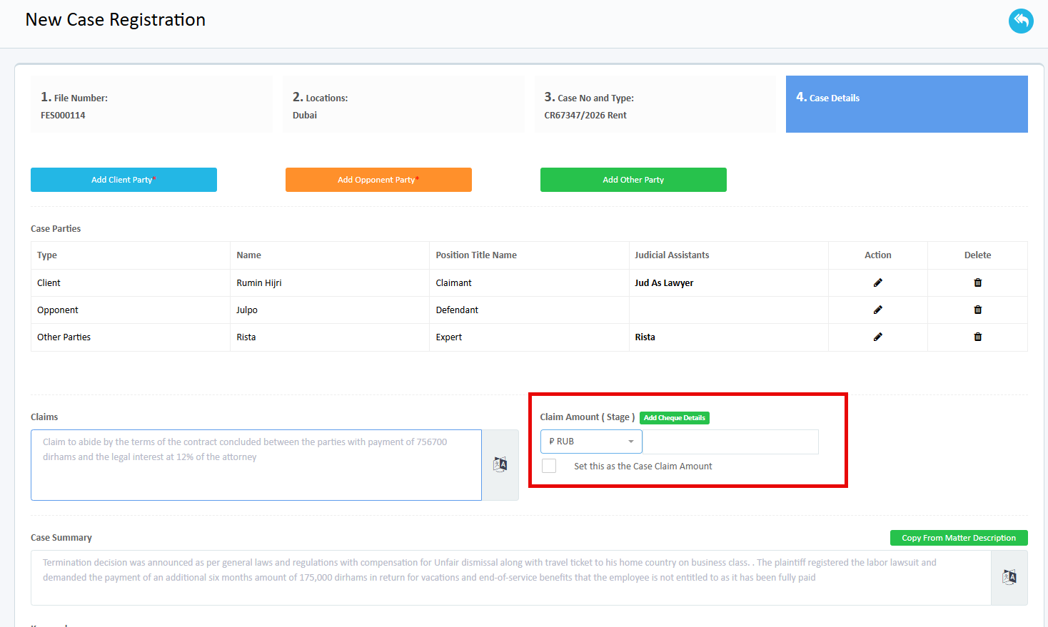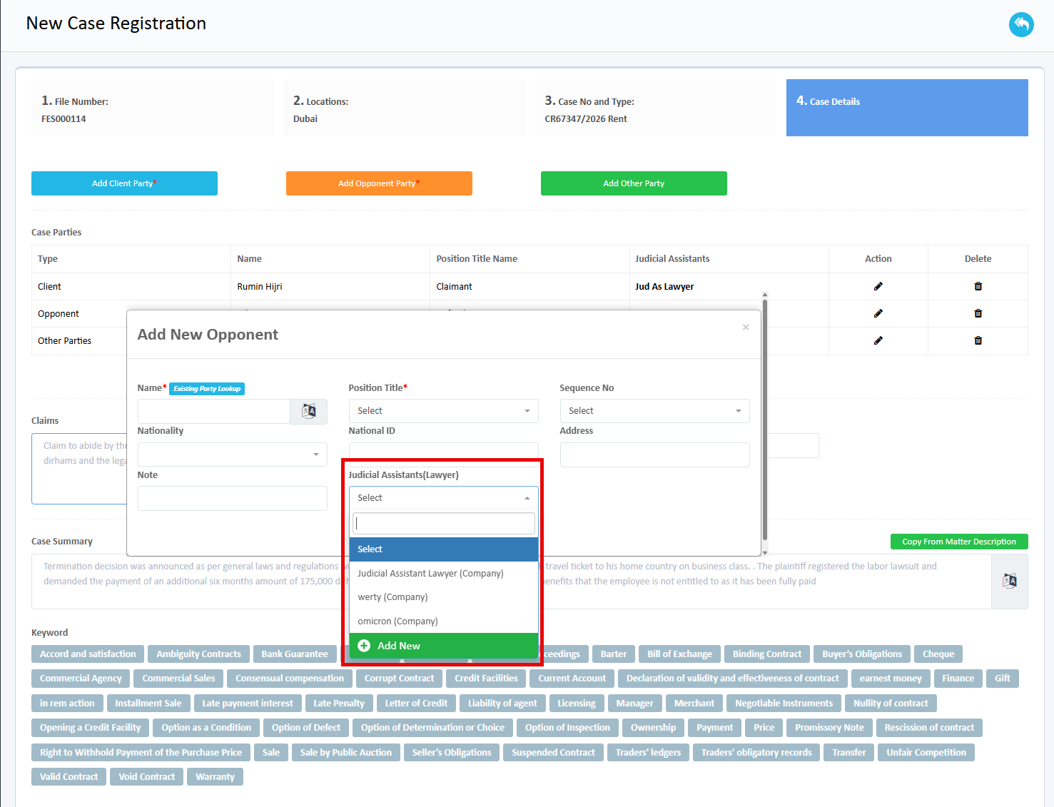 | Case Module Enhancements | Expert, judicial assistant, private executor addition - Now you can add these at the time of case registration without the need to go to the masters.![]() |