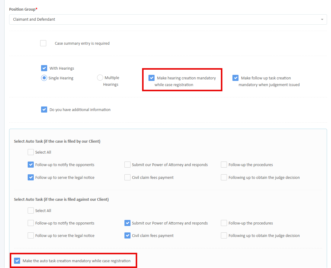 | Hearing and Auto Task Mandatory | Hearing and task mandatory checkboxes in case mapping - Now you can make the auto task and case hearing mandatory for any case type from the case mapping.![]() |