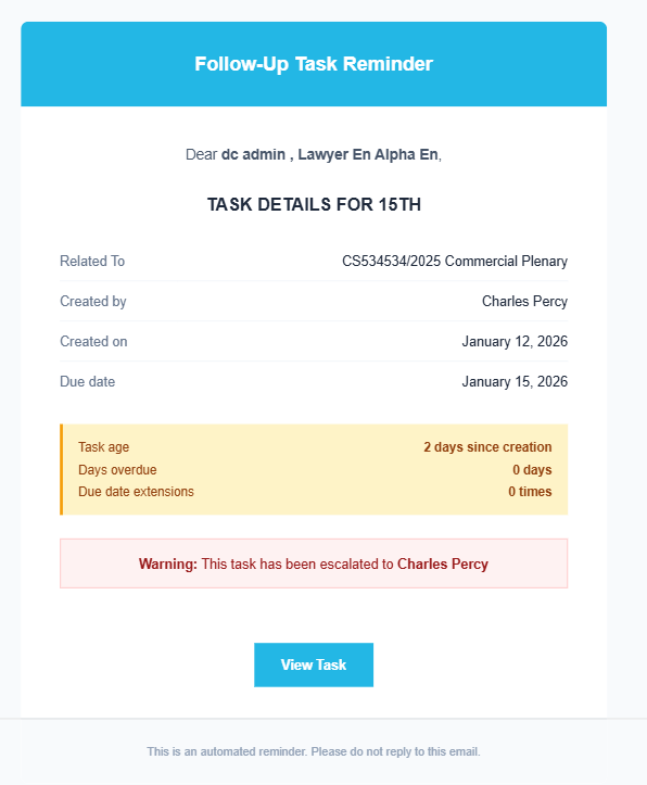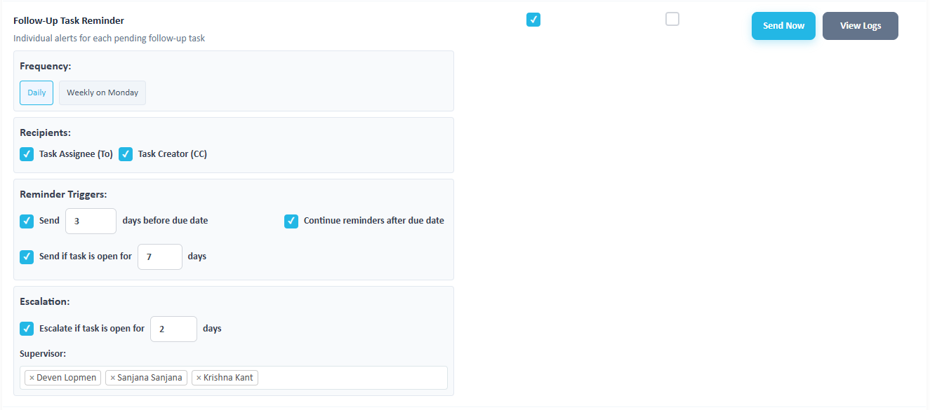 | Follow-up Task Management | Single task reminder functionality - Single reminder for each task with option to escalate it to supervisor. It can be enabled from the email reminder settings page.![]() |