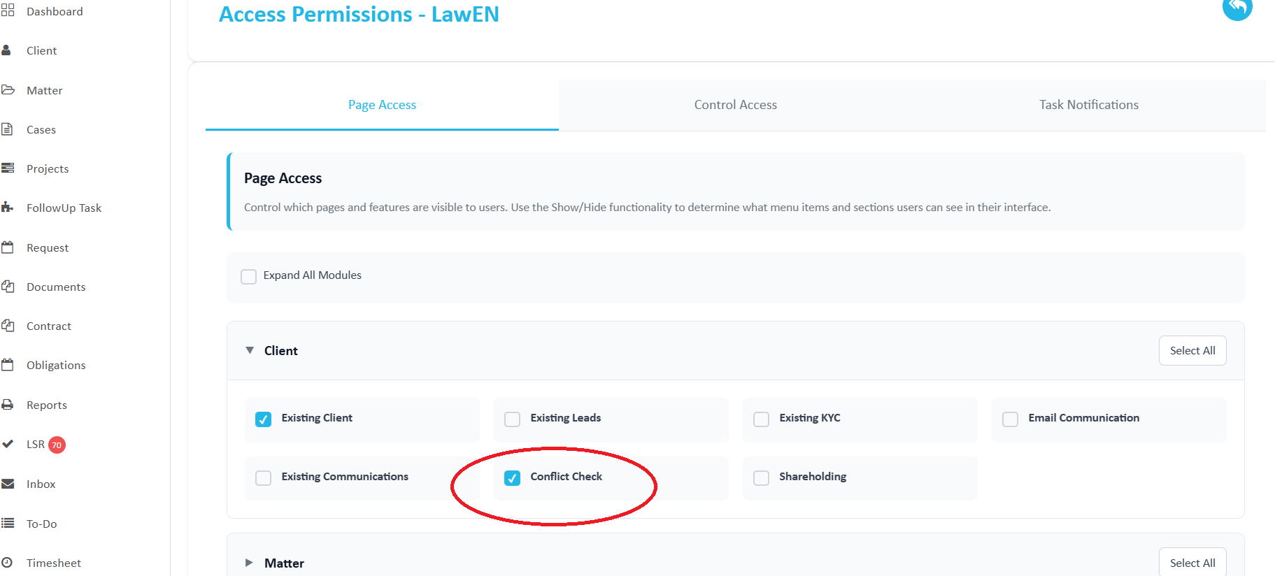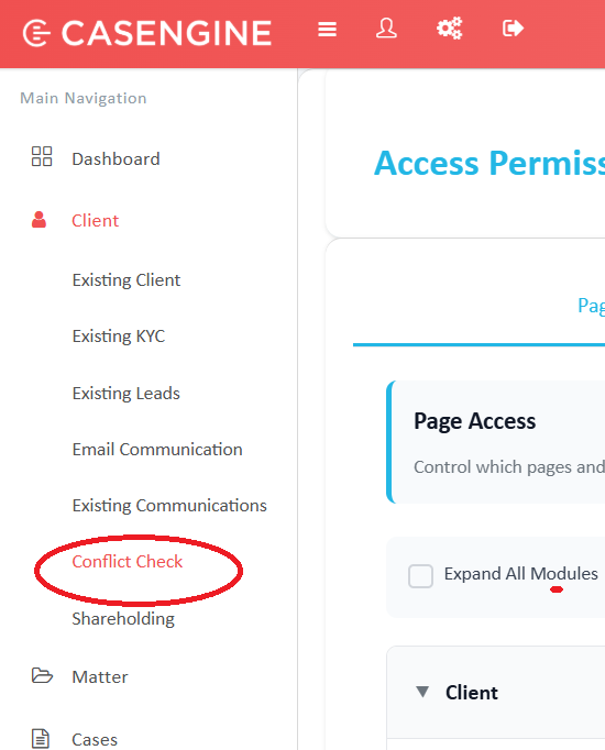 Once enabled, the Conflict Check menu will be available under the Client section.