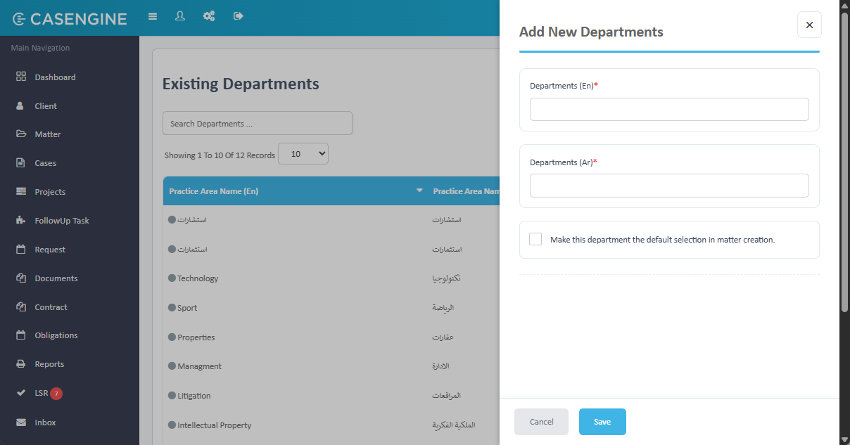 - Set Default Department: Check this checkbox to make this department the default selection in the department dropdown during matter creation