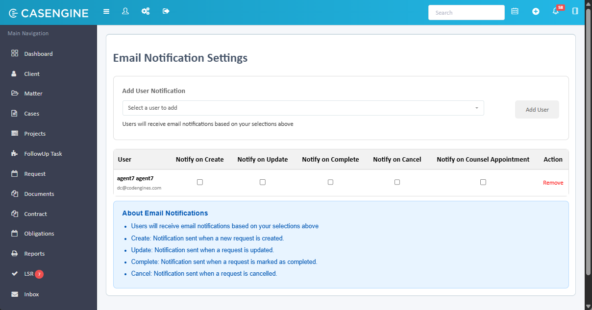 - Add User button: Adds the selected user to the notification list